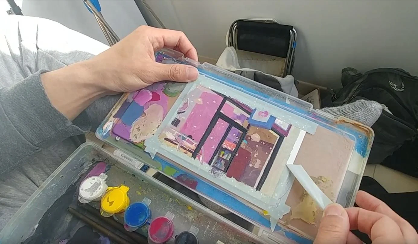 Cheap, lightweight and durable plastic jewelry box, doubles as palette and paint box. Fill compartments with premixed paint: water + paint, milkshake consistency. Or use paint pots so you can switch colors around easily. The lid is used as a palette and to hold your watercolor paper block. The whole paint box setup sits on your lap.